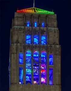 As a result, the new lighting system creates a subtle glow within the tower highlighting the Baird Carillon bells and the top openings. The system can also illuminate the bells and tower in a spectrum of colors and provide theatrical effects and animations.